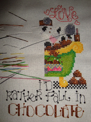 I wonder what I need to stitch above the lovely cow, who is sitting in a bad of choclate i think.