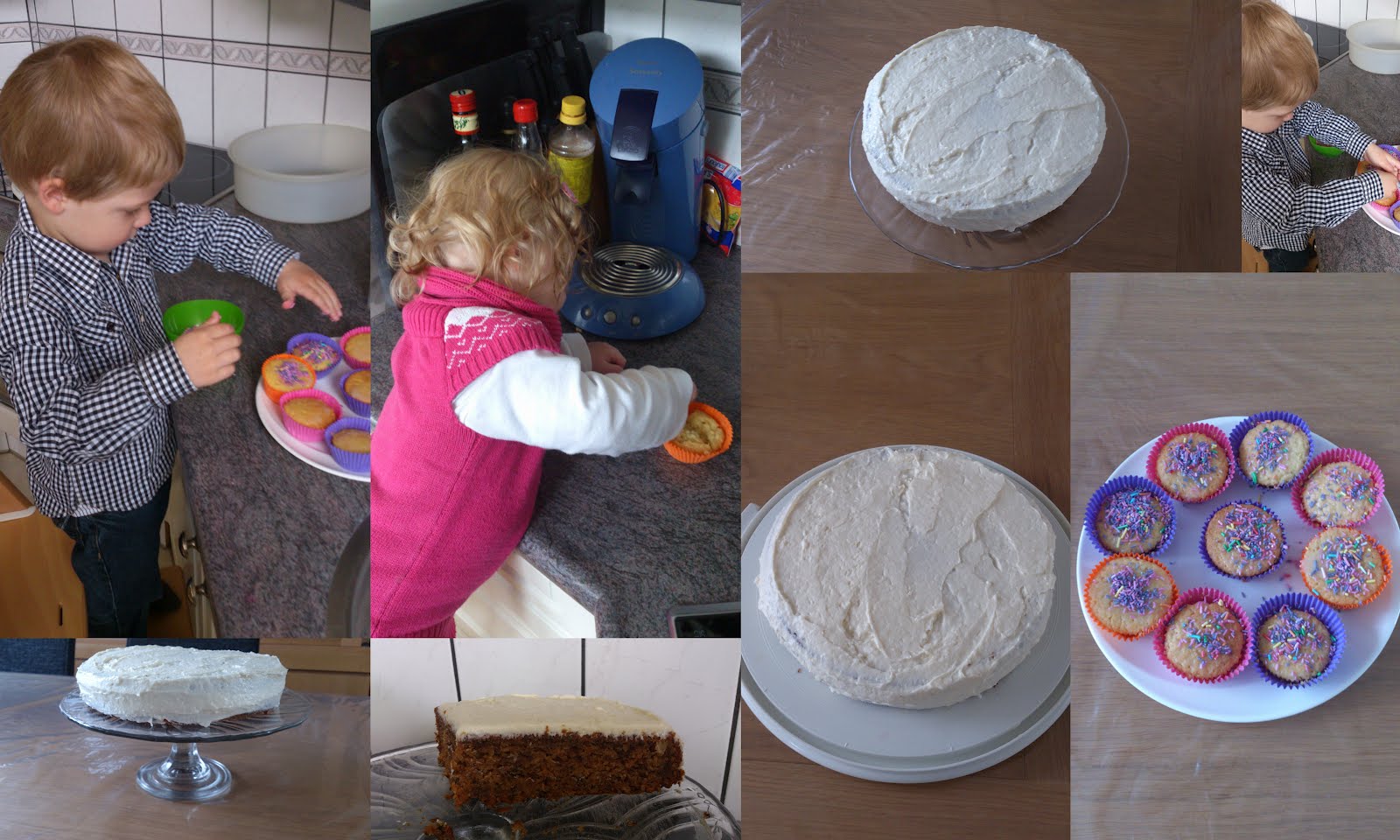 I think it's so cute.. It's still hanging in my living. I so love it. As you could see I made a matching diaper cover, and also a cute sweet hairpin from the same fabric as Kira's dress. This week I hope making another dress for her. I also have been baking. Last week I baked a pie.. but not a pie like I normal do. I baked a carrot cake with coconut cream cheese frosting... how do you think about that? And yummy that it was... Not every-one needs to like it, so I couldn't let visiters go how without eating something, so Noah and me also baked some cupecakes, I did some simple frosting on it and he the sprinkles.. and ira.. well so can only eat so that's what she did when she say the cupcakes.. put her finger in it and mark it to be hers...My sweetie-pie